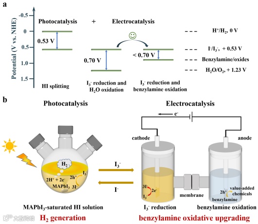 图1. (a) H+/H2、I-/I3-、H2O/O2以及苄胺/相应氧化产物的氧化还原电位,以及HI裂解、I3-还原与水氧化、I3-还原与苄胺氧化所需的电压。(b) 高效产氢与节能苄胺氧化升级的光电协同循环系统示意图。