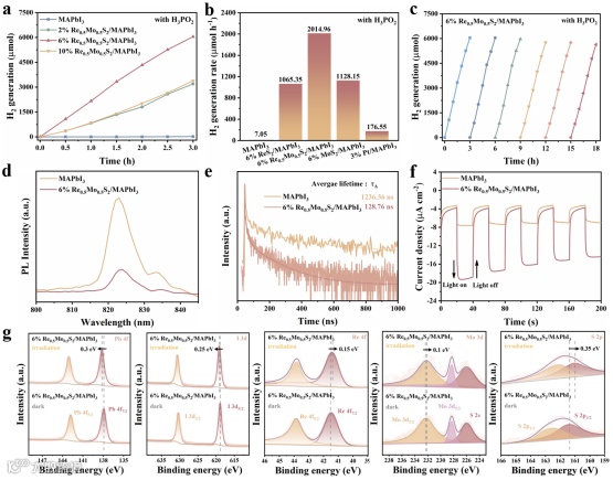 图3. (a) MAPbI3及2%、6%、10% Re0.5Mo0.5S2/ MAPbI3的光催化产氢活性;(b) MAPbI3、6% ReS2/MAPbI3、6% Re0.5Mo0.5S2/MAPbI3、6% MoS2/MAPbI3和3% Pt/MAPbI3的光催化产氢速率对比;(c) 6% Re0.5Mo0.5S2/MAPbI3的循环光催化产氢测试;(d) MAPbI3与6% Re0.5Mo0.5S2/MAPbI3的稳态荧光(PL)光谱;(e) 时间分辨荧光(TRPL)光谱;(f) 瞬态光电流响应;(g) 黑暗和光照条件下6% Re0.5Mo0.5S2/MAPbI3中Pb、I、Re、Mo和S元素的XPS谱比较。