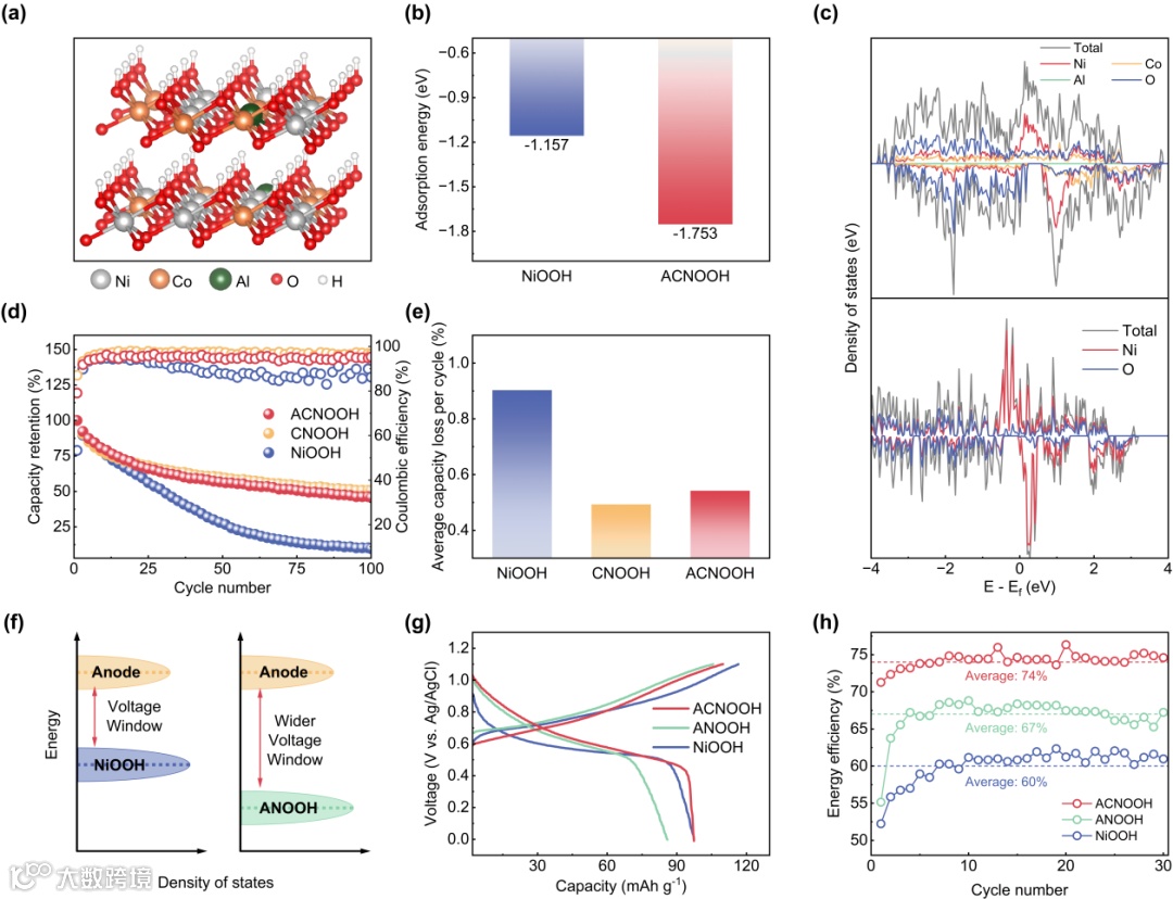 为了探究元素改性的原理,本研究制备了仅有Al元素引入的ANOOH以及仅有Co元素引入的CNOOH。研究发现,Al元素能够降低正极的费米能级,提升其放电电压,进而提升能量密度;而Co元素能够抑制充放电过程中的副反应,提升循环稳定性。二者协同作用,提升了正极材料的能量密度、能量效率以及循环稳定性。