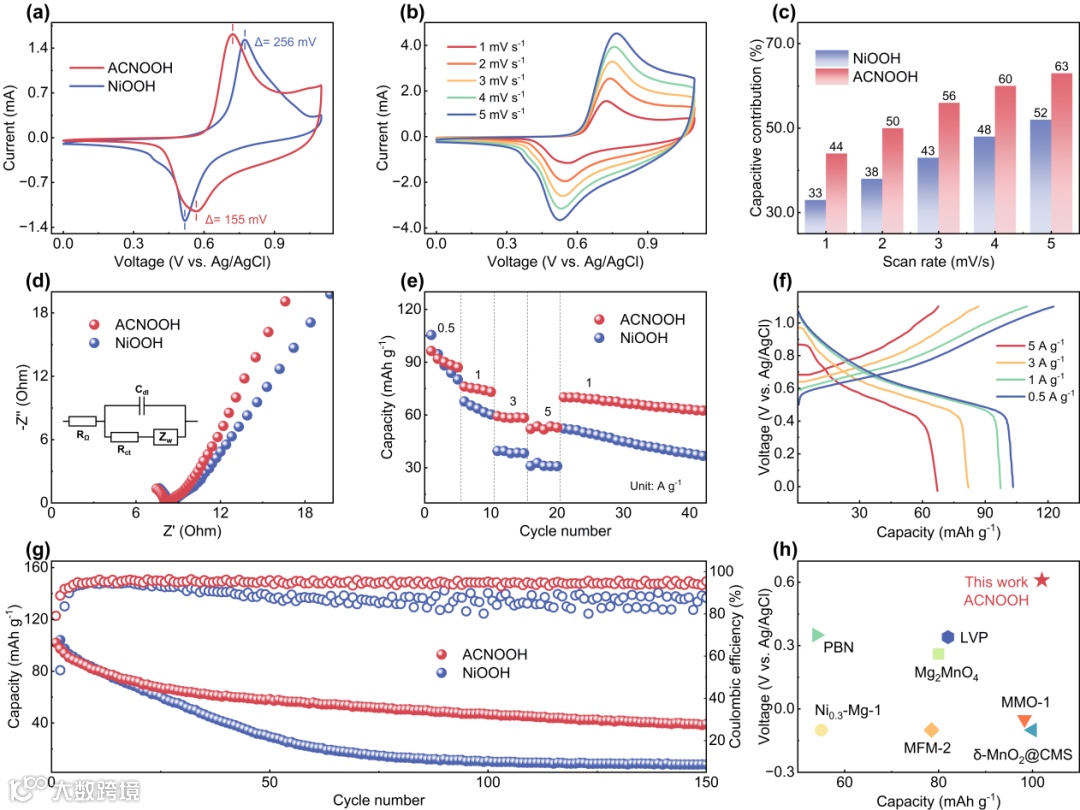在三电极系统中对ACNOOH进行电化学性能测试。相比NiOOH,ACNOOH表现出更低的极化以及更快的离子扩散速率,并且具有更优的倍率性能与循环稳定性。ACNOOH在1 A g-1的电流密度下能够表现出0.62 V(vs. Ag/AgCl)的高放电电压和102 mAh g-1的放电比容量,在水系镁离子电池正极中处于较高水平。