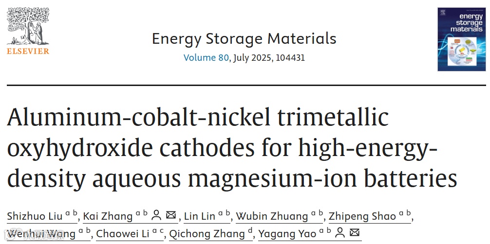 近日,南京大学姚亚刚教授团队在国际知名期刊Energy Storage Materials上发表了题为“Aluminum-Cobalt-Nickel Trimetallic Oxyhydroxide Cathodes for High-Energy-Density Aqueous Magnesium-Ion Batteries”的观点文章。该研究合成了一种新型铝钴镍三元金属羟基氧化物(ACNOOH)正极材料,旨在通过用铝和钴对羟基氧化镍(NiOOH)进行元素改性来克服这些限制。凭借增强的结构稳定性和加速的内部离子传输优势,ACNOOH相比NiOOH表现出了更高的循环稳定性和能量密度。这种元素改性策略显著提高了正极材料的电化学性能,有助于促进AMIBs的发展与应用。