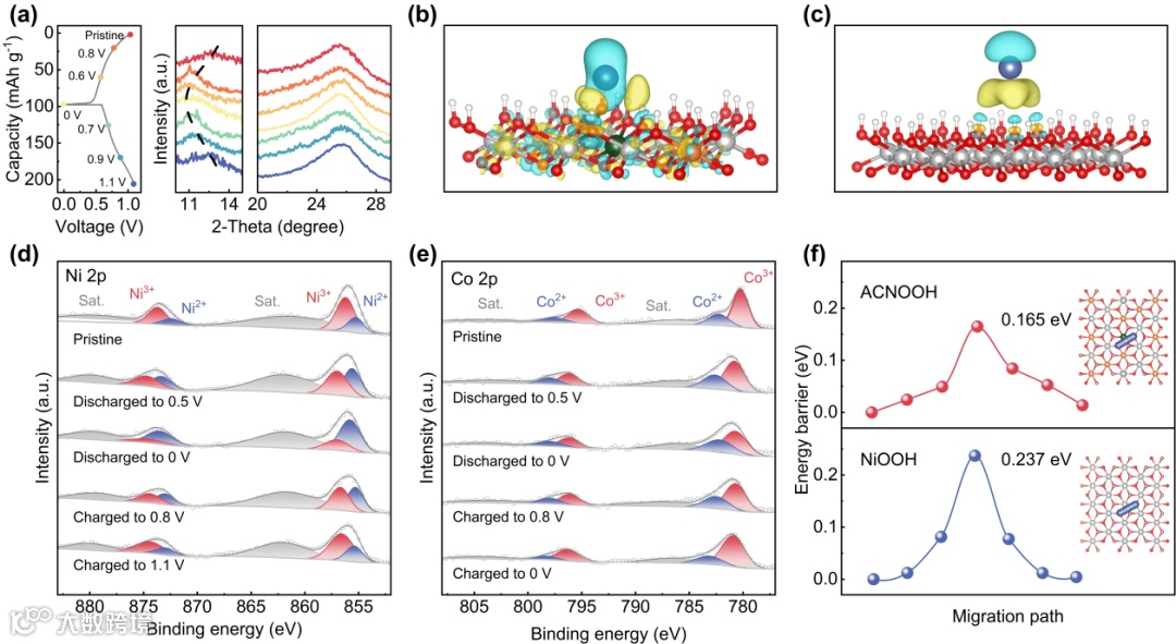 通过准原位表征对ACNOOH的储镁机制进行探究。在充放电过程中,XRD图谱显示ACNOOH的层间距发生可逆的变化,XPS图谱显示元素价态也随之发生变化,其中,Ni元素价态变化比例较大,而Co元素价态变化比例较小,意味着ACNOOH正极的容量主要由Ni元素提供。通过DFT计算发现,相比NiOOH,ACNOOH与Mg2+具有更强的电荷交换能力,并且Mg2+在ACNOOH正极内具有更低的迁移势垒,利于提升其倍率性能。
