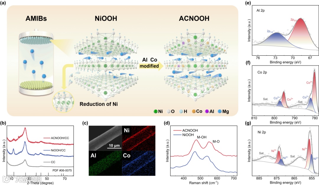 水系镁离子电池(AMIBs)作为一种具有巨大应用潜力的水系储能系统,其正极开发面临着关键挑战,探索和优化高能量密度正极材料对于推动AMIBs走向实际应用至关重要。过渡金属化合物在储能应用中展现出巨大的发展潜力,NiOOH中的Ni3+/Ni2+氧化还原对以及其独特的层状结构,使正极材料能够表现出相对较高的能量密度并具有巨大的未来发展潜力。遗憾的是,NiOOH在热力学上不稳定,具有强氧化性,容易被还原为氢氧化镍[Ni(OH)2]而失去储镁能力,因此提升正极稳定性便显得尤为重要。另外,在水系电解质稳定性窗口内提升工作电压也是提高AMIBs能量密度的可行途径。本研究在NiOOH中引入Al、Co元素进行改性,提升了正极的能量密度与循环稳定性,优化其电化学性能表现。