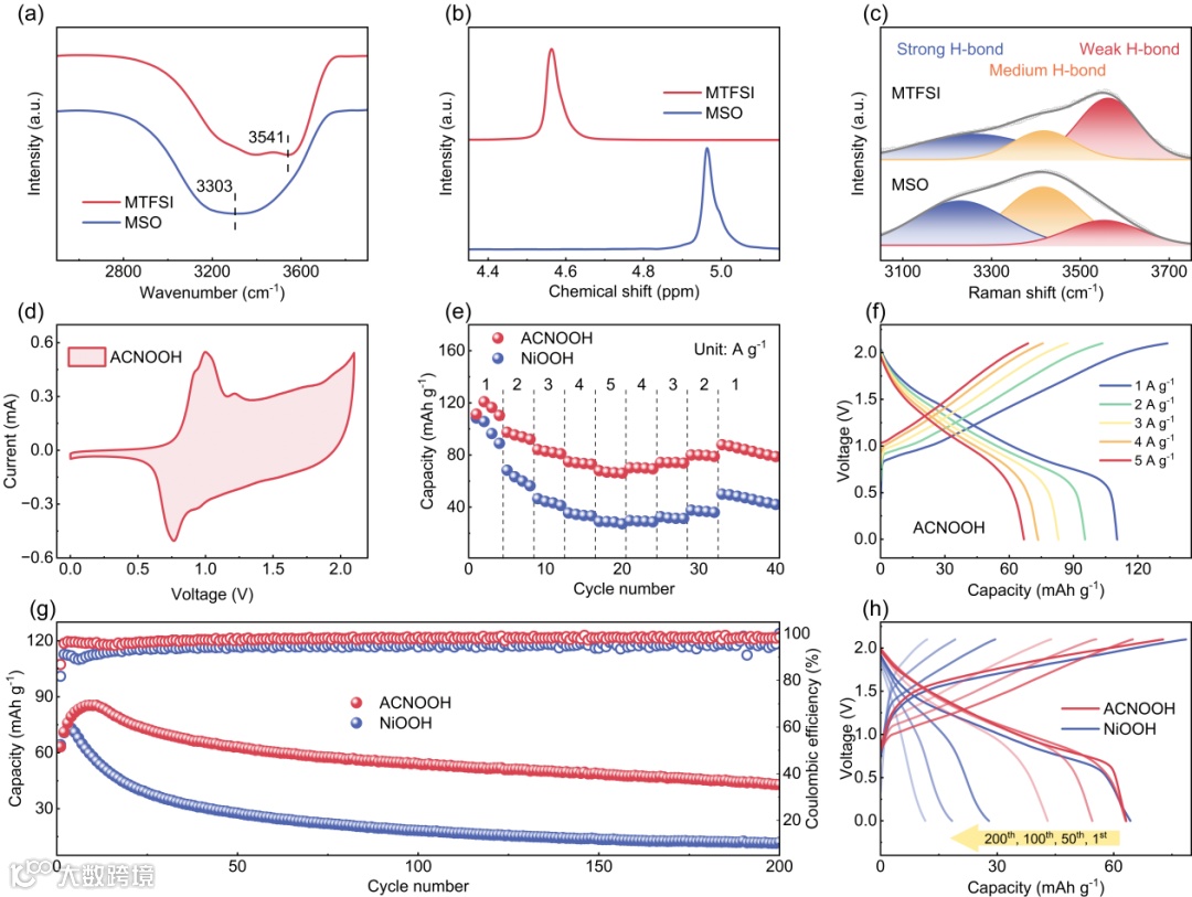 在组装全电池时,为了进一步抑制副反应,采用了水活性更低的4 m Mg(TFSI)2电解质(MTFSI)。ACNOOH//PTCDI全电池具有比NiOOH//PTCDI全电池更高的循环稳定性以及更优的倍率性能,在1 A g-1的电流密度下能够表现出高达127.07 Wh kg-1的能量密度,即使电流密度增加至5 A g-1,能量密度也能够保持在74.25 Wh kg-1。
