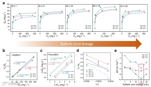 图5. St-V-x的吸附等温线(a)及其模型拟合曲线(b-c);吸附热力学拟合曲线(d)和ΔG(e)