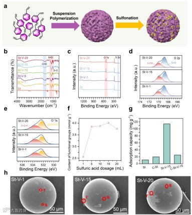 首先通过如图2(a)所示的悬浮聚合法构筑了富含苯环骨架的成型聚合物(St),随后使用浓硫酸磺化法对St进行磺酸基团功能化,通过系统调控磺化时间、温度及硫酸用量等关键因素,成功制备了磺酸基团含量可控的系列磺酸型成型聚合物吸附材料(St-V-x)。