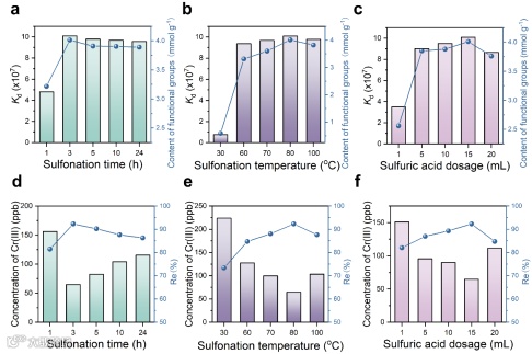 图3. 调控磺化反应条件(温度、时间及硫酸投加量)所制备磺酸型成型聚合物吸附材料的基团含量与对Cr3+吸附分配系数(Kd)(a-c);经“吸附-重结晶”过程后,工业级三(2-羧乙基)异氰脲酸酯中Cr3+剩余浓度和去除率(d-f)