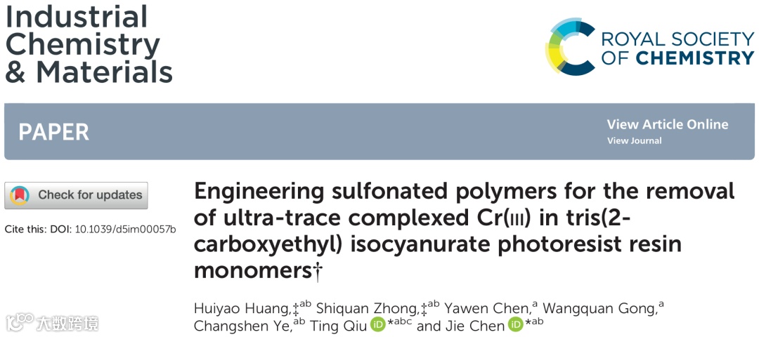福州大学邱挺&陈杰教授:磺酸型聚合物:解锁光刻胶树脂单体痕量络合态Cr³⁺脱除的“破络-吸附”密钥