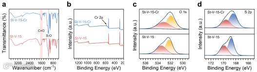 图7. St-V-15吸附Cr3+前后的FT-IR谱图(a)、XPS全谱(b)、O 1s(c)和S 2p精细谱(d)