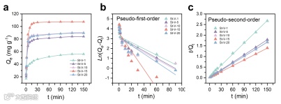 图6. St-V-x的吸附动力学曲线(a)及其模型拟合曲线(b-c)