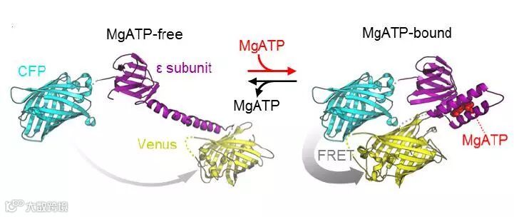 图1,ATP感应蛋白ATeam1.03-nD/n ATP结合效应示意图
