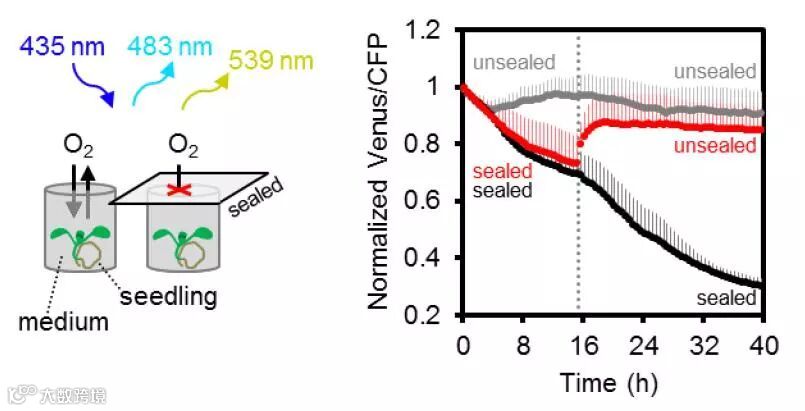 正常大气环境下,ATP含量维持稳定不变(灰色曲线),Venus/CFP荧光信号比值维持稳定。低氧条件下,ATP产量下降,Venus/CFP荧光信号比值下降(黑色和红色曲线)。