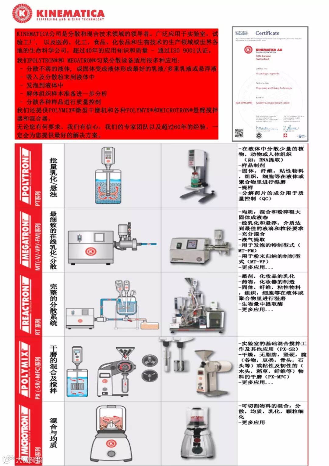 Kinematica品牌由定转子分散技术之父---Willems教授在瑞士创立,拥有全球领先的分散、乳化、匀浆、均质和研磨技术,一直是这一技术领域的领导者。Kinematica利用其专利的转子/定子原理,使均质器通过降低固体颗粒,液滴和气泡粒径的尺寸,使其达到微米级或更低,以此来达到分散乳化或起泡的均质效果。凭借四十多年的研发,制造及应用历史,以及瑞士制造的优良传统,Kinematica可提供从实验室到中试、产业,从标准到定制的各种样品处理解决方案。
