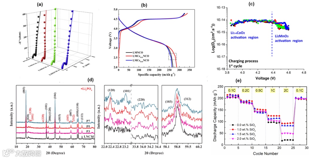 图6(a)简单样品和Li2WO4涂层样品的EIS。(b)LMCexNCO(0,0.01,0.03)正极的电化学性能。(c)在不同的电池电压下,计算了第1次和第100次充电循环的锂离子扩散系数。(d)在制备材料的XRD图中监测Li3PO4相。(e)未涂覆和涂覆SiO2的Li1.2Ni0.13Mn0.54Co0.13O2(SiO2=1.0、1.5和2.0 wt%)材料的额定性能。