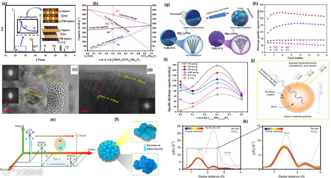 图3(a)各相的晶胞和0.5Li2MnO3·0.5LiMn0.50Ni0.35Co0.15O2(LLMNC)XRD图。(b)第一次循环期间富锂层状氧化物的预期容量(相对于xLi2MnO3·(1-x)LiNi0.5Mn0.5O2中的x)。(c.d)棱镜LMCNO-800和LMCNO-950透射电子显微镜照片。(e)通过阳离子氧化还原(CR)和阴离子氧化还原(AR)调节NCM正极(富镍和富锂层状氧化物)的预期高性能图。(f)在富锂层状氧化物中构建3D纳米多孔结构示意图。(g)LRLO-S的杨梅状结构优于LRLO-N的几个优点的图示。(h)在2.0-4.8 V、20 mA g-1的情况下,在不同温度下检查电池的充电/放电曲线和循环性能。(i)合成化合物的速率能力是Li(Li(1-x)/3Mn(x+2)/3)O2中x的函数。(j)该图显示了沿充放电曲线在不同电压下从电池中取出的正极的能量调谐X射线光电子能谱测量。(k)LNRO在初始循环中的Ru k边EXAFS。原位电池在C/10充电,在C/7放电。