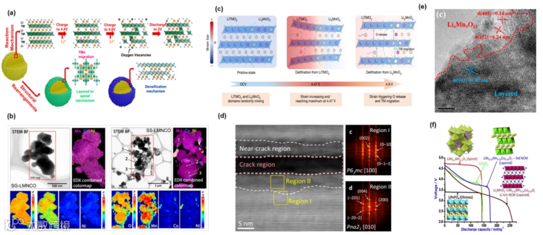 图4(a)LRLO的电化学插层/脱层和结构演变。(b)具有亮场(BF)和SG-LMNCO和SS-LMNCO EDX图的STEM数据。(c)应变、氧释放和过渡金属运动。(d)阴离子氧化还原和结构演化驱动的裂缝形成。(e)SLN-LMNCO的HRTEM图像。(f)基于Li参比电极,测量电势。