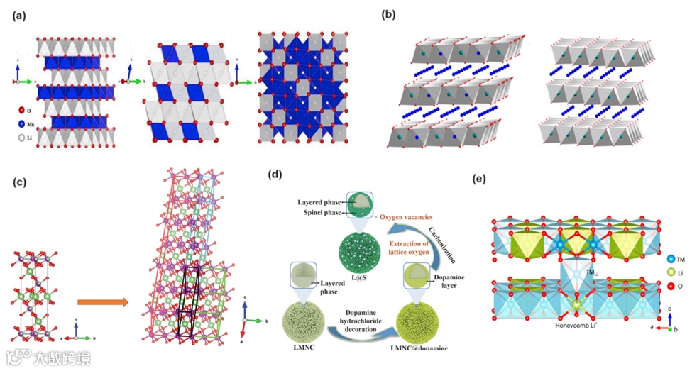 图2(a)三种化合物的晶体结构示意图:层状LiMO2、单斜晶系Li2MnO3和尖晶石型Li4Mn5O12。(b)示出了Li2MnO3和LiMO2结构。过渡金属原子是深绿色的,Li原子是蓝色的,O原子是红色的。(c)单斜晶胞为黑线,留下初始的菱面体晶胞。RC 3a 3b(红色)、RC 3b(绿色)和RC 3ab-ac是超单元。(d)将氧空位引入L@S正极材料的示意图。(e)显示蜂窝附近TMLi原子的结构截面。
