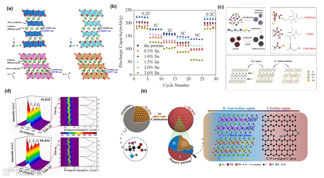 图5(a)C-LMNCO和S-LMNCO中C2/m相和R3̅m相的结构模型。(b)对掺杂不同Sn水平的氧化物的速率性能的研究。(c)SCLR的简明合成程序,球棒表示,通过Na+掺杂增强结构稳定性的示意图。(d)0.5℃下PLRM和HLRM前三个循环的原位峰(003)的演变。(e)多功能全界面集成工程后PLRM和HLRM表面结构示意图。