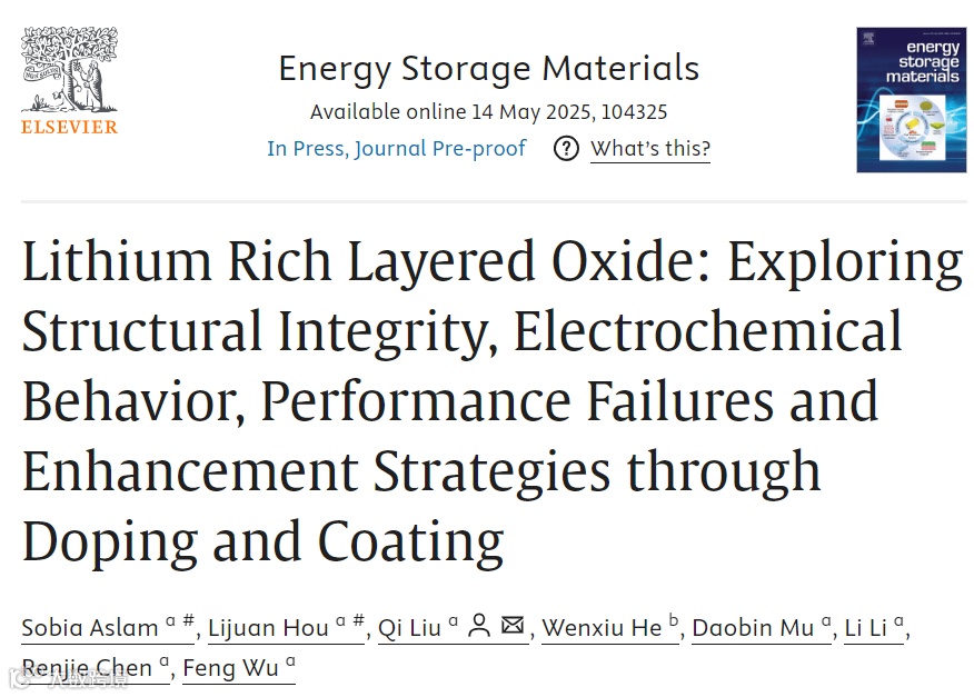 Sobia Aslam#, Lijuan Hou#, Qi Liua*, Wenxiu He, Daobin Mu, Li Li, Renjie Chen, Feng Wu, Lithium Rich Layered Oxide: Exploring Structural Integrity, Electrochemical Behavior, Performance Failures and Enhancement Strategies through Doping and Coating, Energy Storage Materials (2025), doi: