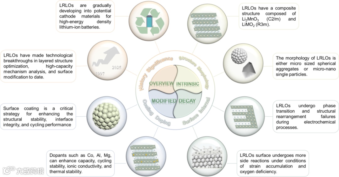 锂离子电池虽然革新了储能领域,但在正极材料改进方面仍面临诸多挑战,包括容量衰减和制造成本高昂等问题。研究人员正通过探索富锂化合物等先进材料来应对这些难题。富锂层状氧化物作为新一代高能量密度正极材料前景广阔,但其实际应用仍受限于电压衰减、容量衰退、结构不稳定和循环性能差等瓶颈。本综述旨在通过系统分析这类材料的晶体结构、形貌特征和电化学性能来填补知识空白,重点探究元素掺杂和表面包覆等改性技术对其性能的影响机制。