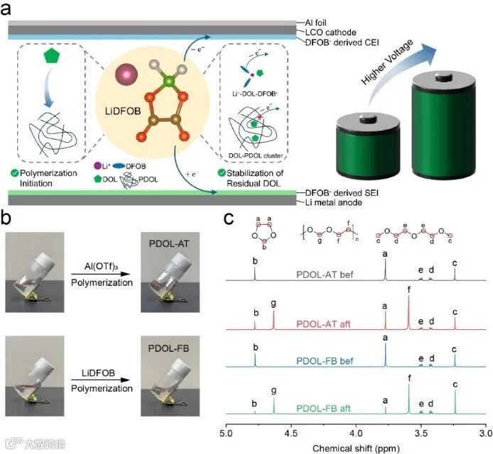 在固态电解质的开发中,DOL单体原位聚合常面临单体转化不完全、残余单体易被氧化的问题。传统引发剂如Al(OTf)3虽能实现聚合,但稳定性和兼容性仍有限。研究团队创新性地采用LiDFOB作为引发剂,首次实现“双重功能”:一方面,通过开环聚合固化DOL单体,促进Li+–DOL–DFOB–稳定溶剂化结构和DOL–PDOL聚集体的形成;另一方面,LiDFOB在电极界面优先分解,构建富含LiF的SEI和CEI,有效稳定残余单体并提高体系电压耐受性。配合添加LiBOB辅助调控聚合物结构,所得PDOL-FB电解质在NMR测试中展现出高达90%的单体转化率,显著优于传统体系(PDOL-AT为79%),验证了高效原位聚合效果。