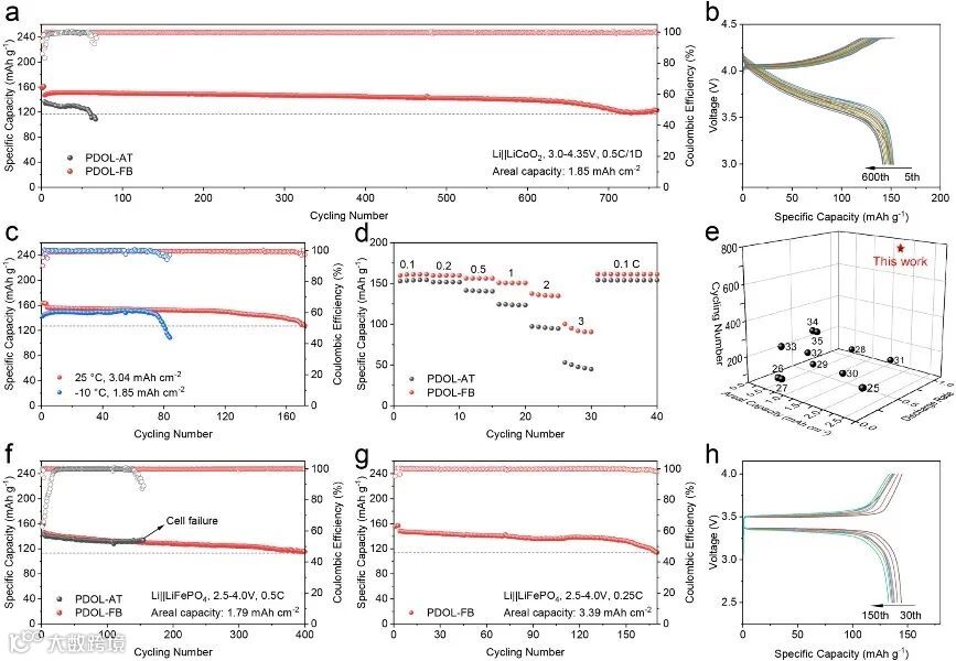 传统PDOL类电解质因残余单体氧化问题,往往仅适用于低电压正极如LFP,在高电压正极LCO下循环性能欠佳。针对这一瓶颈,研究团队设计了一种全新原位聚合电解质PDOL-FB,在高低压体系中均展现出出色的电化学性能。高电压LCO正极下,PDOL-FB电解质在4.35 V电压平台下实现760圈循环后仍保持80%容量,库仑效率高达99.7%。无论是长循环、倍率性能还是低温(–10°C)环境下,其都能维持稳定输出,体现了良好的界面稳定性与离子传输能力,优于传统PDOL-AT体系。低电压LFP正极下,PDOL-FB同样表现强劲。在0.5C倍率下完成400圈循环仍保持80%容量,而对比体系PDOL-AT在150圈后就严重衰减。此外,该体系在1C倍率及商用级LFP电极上也能保持出色的稳定性,循环期间充放电曲线平稳无明显极化。