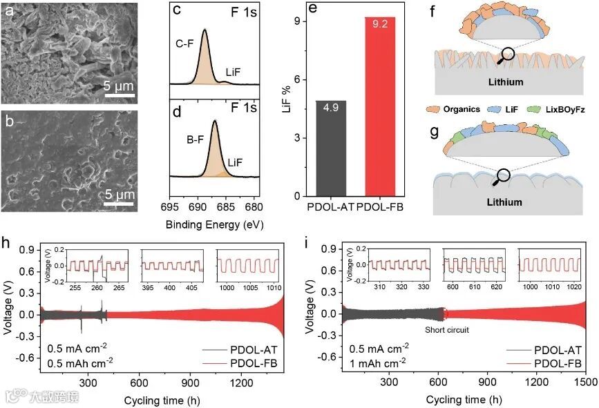 锂金属负极的界面稳定性一直是固态电池研究的核心难题。团队通过对比实验揭示了两种聚合物电解质(PDOL-AT 与 PDOL-FB)在锂沉积行为上的显著差异:PDOL-AT电解质中出现了大量锂枝晶,而PDOL-FB则实现了致密、均匀的锂沉积,未见枝晶生长。这一差异归因于电解质形成的SEI成分不同。XPS分析显示,PDOL-AT形成的SEI以有机组分和少量LiF为主,导致界面不均、结构脆弱;而PDOL-FB则因LiDFOB分解生成富含LiF和LixBOyFz的无机物,从而构建出更稳定、更致密的无机富集SEI层,有效抑制枝晶生长、降低界面阻抗。在对称电池测试中,PDOL-FB体系在0.5 mA cm-2/1 mA h cm-2的电流密度和容量下依然能保持超过1500小时的稳定循环,远优于PDOL-AT仅600小时即出现短路的表现。
