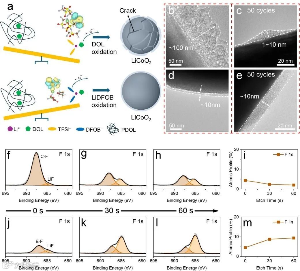 高性能锂电池的关键,在于电解质与正极之间能否形成稳定、致密的界面膜(CEI)。本研究发现,PDOL-FB电解质相较传统PDOL-AT,在CEI结构与性能上实现全面优化,成为高电压电池的关键因素。在PDOL-AT中,DOL单体分解生成厚重、有机富集的CEI,不仅导电性差,还容易在高电压下失稳。而PDOL-FB中的LiDFOB则优先分解,构建出富含LiF的无机型CEI,厚度仅约10 nm(对比PDOL-AT的100 nm),结构更致密且长期循环后无裂纹或剥离现象。TEM显示,PDOL-AT体系中CEI不均、LCO颗粒受损严重,ICP-OES也检测到隔膜中有高浓度溶出的Co离子。而PDOL-FB不仅抑制了这种溶出,界面化学成分(通过XPS)还表现出更深层次、更均匀的F元素分布,主要来源为稳定的LiF和B–F键,进一步增强界面稳定性。