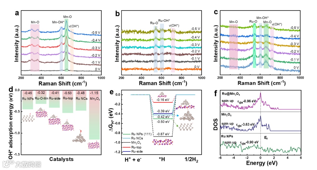 Figure 4. (a–c) In-situ Raman spectra of Mn3O4, Ru NPs, and Ru@Mn3O4. (d) The OH* adsorption energies on Ru NPs, Ru–O–Mn sites, Ru-side, Ru-top, Ru NCs and Mn3O4. (e) The Gibbs free energies of H* (ΔGH*) on Ru NPs, Ru NCs, Mn3O4, Ru-top, and Ru-side. (f) The DOS and d-band centers of Ru NPs, Mn3O4, and Ru@Mn3O4.