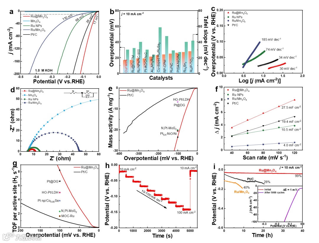 Figure 2. (a) LSV curves of HER on Mn3O4, Ru NPs, Ru/Mn3O4, Ru@Mn3O4, and Pt/C. (b) Comparison of overpotentials and Tafel slopes on Ru@Mn3O4 and the previously reported Ru-based catalysts. (c) Tafel slopes of Ru NPs, Ru/Mn3O4, Ru@Mn3O4, and Pt/C. (d) EIS curves on Mn3O4, Ru NPs, Ru/Mn3O4, and Ru@Mn3O4. (e) The mass activity curves of Ru@Mn3O4 and Pt/C. (f) Cdl curves of Ru NPs, Ru/Mn3O4, Ru@Mn3O4, and Pt/C. (g) TOF curves of Ru@Mn3O4 and Pt/C. (h) Continuous multi-step chronopotentiometry curve of Ru@Mn3O4. (i) Chronopotentiometry (CP) curves on Ru@Mn3O4, Pt/C, and Ru/Mn3O4 at 10 mA cm–2. (Inset in i shows the LSV curves of Ru@Mn3O4 before and after 5000 CV cycles.