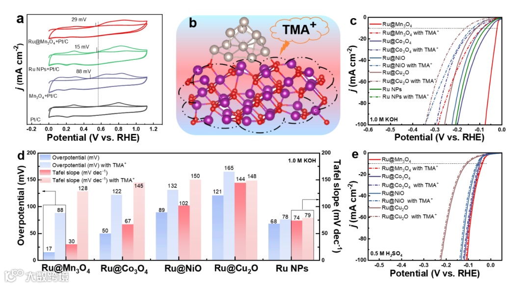 Figure 3. (a) CO-stripping measurements on Pt/C, Mn3O4 + Pt/C, Ru NPs + Pt/C, and Ru@Mn3O4 + Pt/C in 1.0 M KOH. (b) Poisoning mechanism of TMA+ for OH adsorption on Ru@Mn3O4 in 1.0 M KOH solution. (c, d) LSV curves of Ru@Mn3O4, Ru@Co3O4, Ru@NiO, Ru@Cu2O, and Ru NPs before and after the addition of TMA+, and comparison of their overpotentials and Tafel slopes in 1.0 M KOH. (e) LSV curves of Ru@Mn3O4, Ru@Co3O4, Ru@NiO, and Ru@Cu2O before and after adding TMA+ in 0.5 M H2SO4.