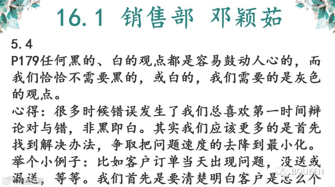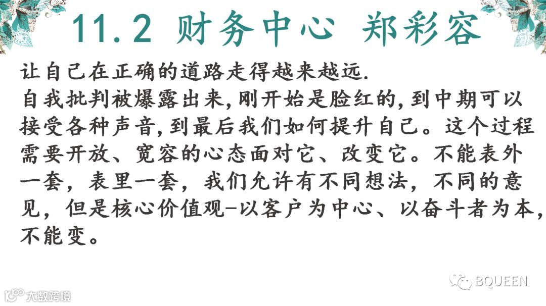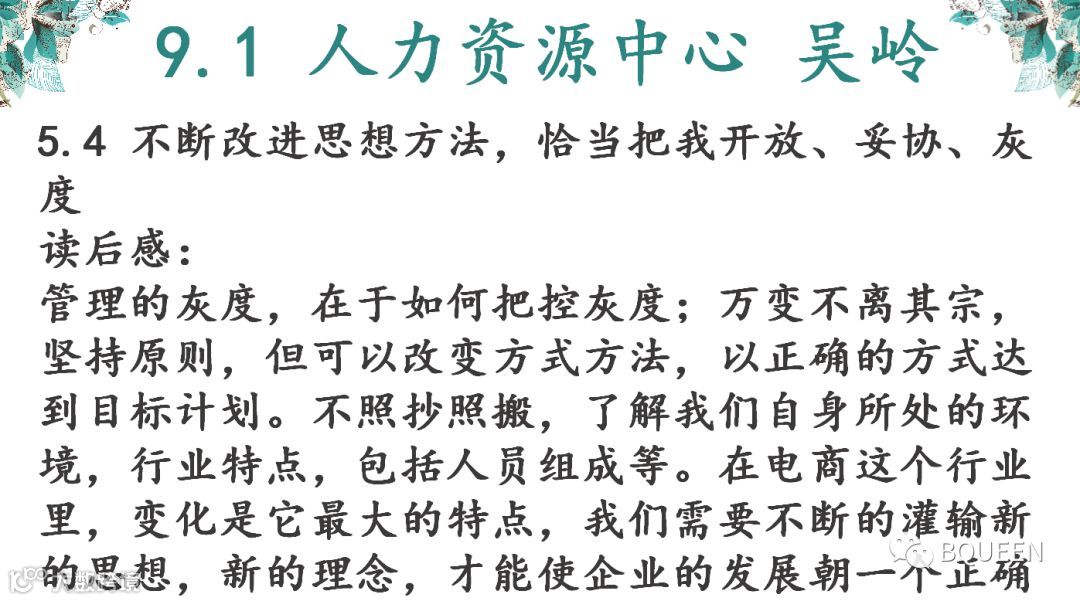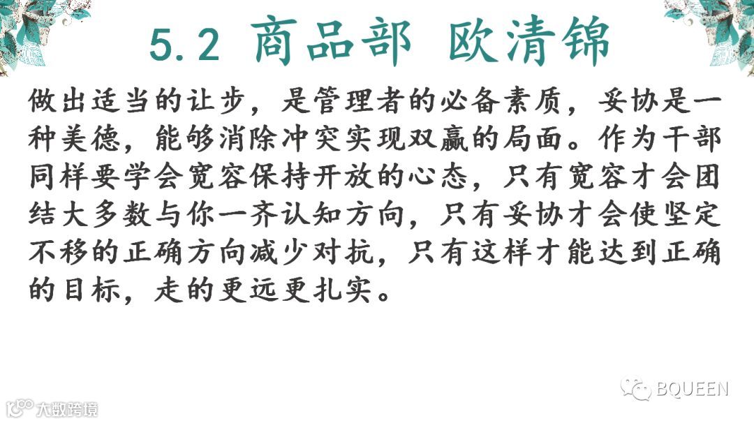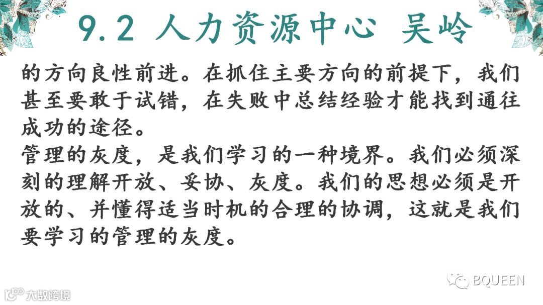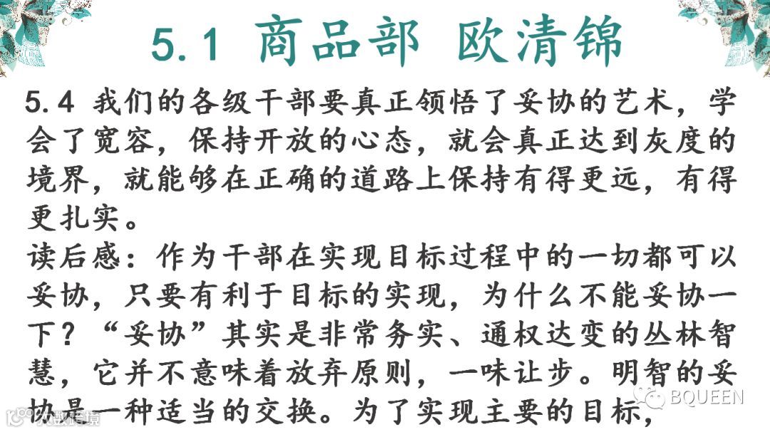 本次分享的章节是《5.4不断改进思想方法,恰当把握开放、妥协、灰度》,主要内容是:开放、妥协、灰度是华为文化的精髓,也是一个领导者的风范。没有宽容就没有妥协;没有妥协就没有灰度;不能根据不同的时间、空间,掌握一定的灰度,就难有合理审时度势的正确决策,开放、妥协的关键,是如何掌握好灰度。