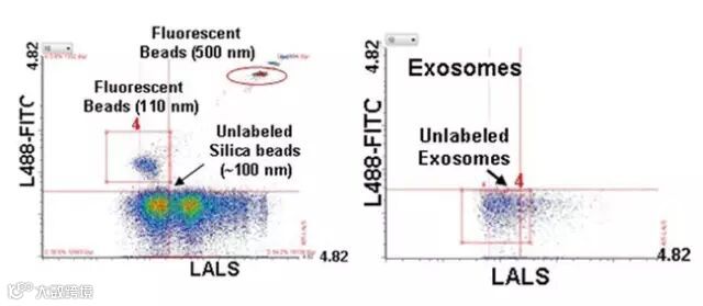 无荧光标记的外泌体散射光强度,与100nm的二氧化硅微球散射强度相当,提示Apogee A50 Micro仅利用散射光即可检测到大小约100nm的单个外泌体。