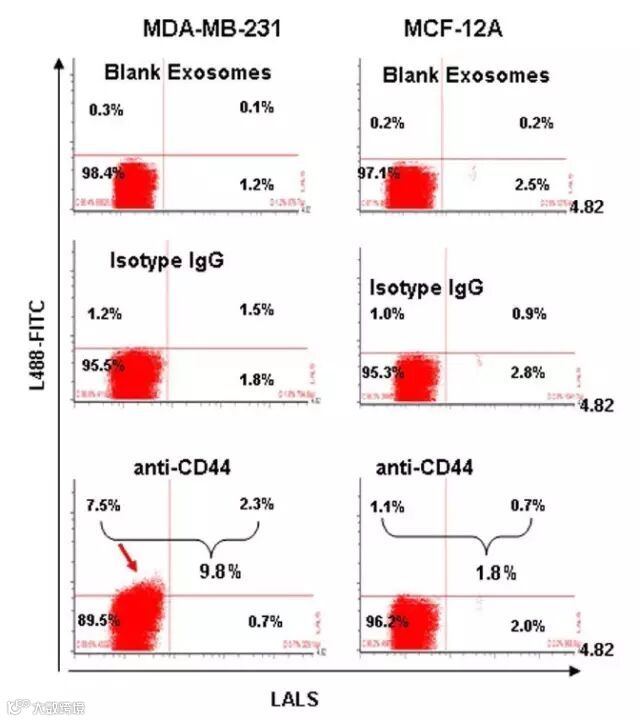 利用图1的检测参数设置,结合CD44荧光标记,分析MDA-MB-231和 MCF-12A 细胞系CD44表达阳性外泌体的丰度差异。