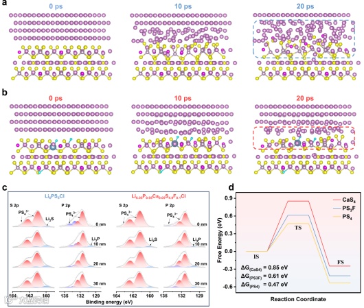 Figure 4. Analysis of interface reaction with Li||Li6PS5Cl and Li||Li6.05P0.95Ca0.05S4.9F0.1Cl . Ab initio molecular dynamics snapshots of (a) Li||Li6PS5Cl and (b) Li||Li6.05P0.95Ca0.05S4.9F0.1Cl interface at 0, 10, and 20 ps. (c) P 2p and S 2p XPS spectra of the Li electrodes after 10 cycles in Li||Li symmetric cells with Li6PS5Cl and Li6.05P0.95Ca0.05S4.9F0.1Cl SSEs, respectively, with different sputtering depth. (d) The calculated Gibbs free energy for the reaction of Li metal with different units.