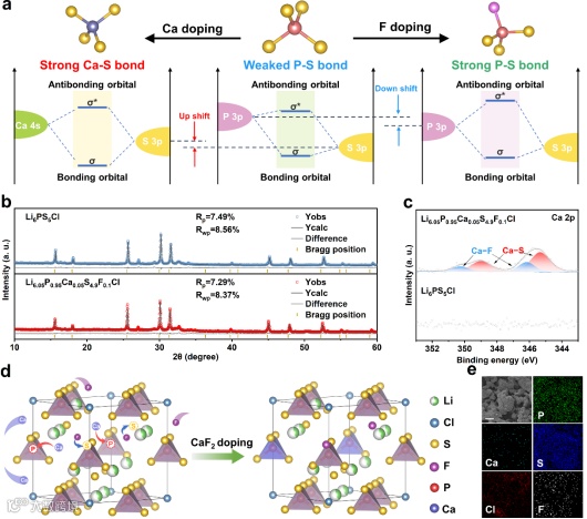Figure 1. The structure properties of Li6PS5Cl and Li6.05P0.95Ca0.05S4.9F0.1Cl SSEs. (a) Schematic illustration of bonding and antibonding states. (b) XRD pattern and corresponding Rietveld refinement results of Li6PS5Cl and Li6.05P0.95Ca0.05S4.9F0.1Cl SSEs. (c) Ca 2p XPS spectra of Li6PS5Cl and Li6.05P0.95Ca0.05S4.9F0.1Cl SSEs. (d) Crystal structure diagram of Li6PS5Cl and Li6.05P0.95Ca0.05S4.9F0.1Cl SSEs. (e) Scanning electron microscope images and corresponding element mapping of Li6.05P0.95Ca0.05S4.9F0.1Cl SSEs. The scale bar is 5 μm.