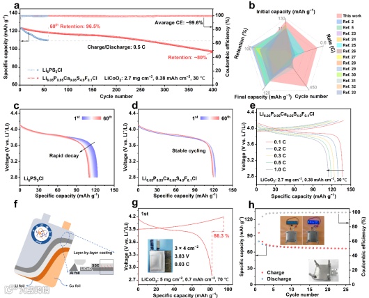 Figure 5. Electrochemical performance of all−solid−state Li metal batteries. (a) Cyclability of Li||LiCoO2 full cells with Li6PS5Cl and Li6.05P0.95Ca0.05S4.9F0.1Cl SSEs. (b) Performance comparison of Li6.05P0.95Ca0.05S4.9F0.1Cl with other SSEs for Li||LiCoO2full cells. Discharge voltage profiles of Li||LiCoO2full cells with (c) Li6PS5Cl and (d) Li6.05P0.95Ca0.05S4.9F0.1Cl SSEs from 1st to 60th cycles. (e) Charge/discharge voltage profiles of Li||LiCoO2full cells with Li6.05P0.95Ca0.05S4.9F0.1Cl SSEs at different rate. (f) Schematic illustration of all−solid−state pouch cell and layer−by−layer casting. (g) Charge/discharge voltage profiles (insert: digital photographs of all−solid−state Li metal pouch cell) and (h) cyclability of all−solid−state Li||LiCoO2 pouch cell with Li6.05P0.95Ca0.05S4.9F0.1Cl SSEs (insert: digital photograph of all−solid−state Li metal pouch cell inserted into test fixture and lighting up LEDs).