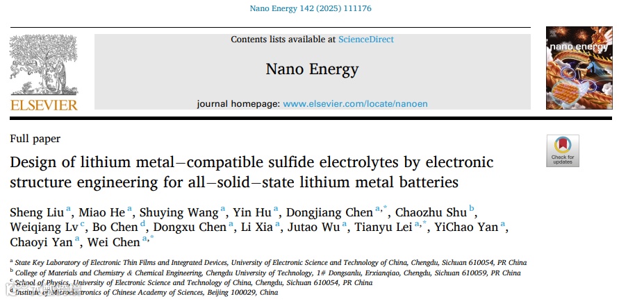近日,电子科技大学陈东江/雷天宇/陈伟团队在Nano Energy期刊发表题为“Design of lithium metal- compatible sulfide electrolytes by electronic structure engineering for all- solid- state lithium metal batteries”的研究论文。团队通过F/Ca双原子协同掺杂重构硫化物固态电解质(Li₆PS₅Cl)的化学键特性,解决了其与锂金属负极的界面兼容性难题,实现了高临界电流密度(1.6 mA cm-2)和长循环稳定性(0.2 mA cm-2下循环超3000小时)。组装的Li||LiCoO₂全电池400次循环后容量保持率80%,柔性软包电池成功驱动LED阵列。该工作为通过本征电子结构调控设计高稳定性固态电解质提供了新范式。