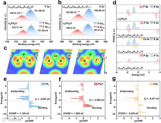 Figure 2. The electronic structure analysis of Li6PS5Cl and Li6.05P0.95Ca0.05S4.9F0.1Cl SSEs. (a) P 2p and (b) S 2p XPS spectra of Li6PS5Cl and Li6.05P0.95Ca0.05S4.9F0.1Cl SSEs. (c) Electronic localization function of Li6PS5Cl (left) and Li6.05P0.95Ca0.05S4.9F0.1Cl (middle and right) SSEs. (d) Calculated partial density of state of Li6PS5Cl and Li6.05P0.95Ca0.05S4.9F0.1Cl SSEs. The crystal orbital Hamilton population of the (e) PS4 unit in Li6PS5Cl SSEs and the (f) PS3F and (g) CaS4 unit in Li6.05P0.95Ca0.05S4.9F0.1Cl SSEs.