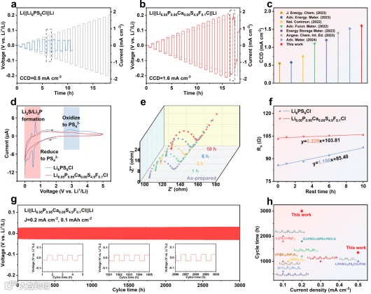 Figure 3. Stability properties of Li6PS5Cl and Li6.05P0.95Ca0.05S4.9F0.1Cl SSEs. The critical current density of the Li||Li symmetric cell with (a) Li6PS5Cl and (b) Li6.05P0.95Ca0.05S4.9F0.1Cl SSEs. (c) Summary of reported critical current density of SSEs. (d) CV profile of Li||In cell with Li6PS5Cl and Li6.05P0.95Ca0.05S4.9F0.1Cl SSEs. (e) The Nyquist plots of Li||Li symmetric cell with Li6.05P0.95Ca0.05S4.9F0.1Cl SSEs. (f) The relationship between cell impedance and rest time. (g) The cycling performance of Li||Li symmetric cell with Li6.05P0.95Ca0.05S4.9F0.1Cl SSEs. (h) Summary of reported cycling performance and corresponding plating/stripping current density of Li||Li symmetric cell with SSEs.