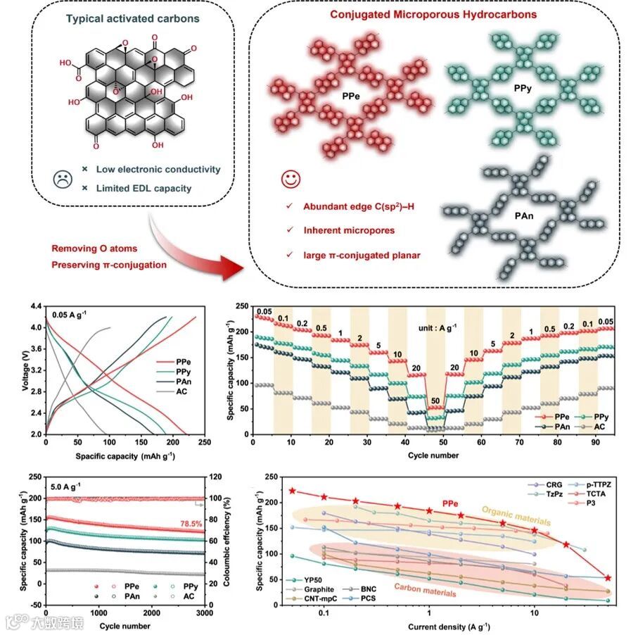 该研究团队创新性采用亚石墨型多环芳烃(PAH)作为构建单元,通过Suzuki偶联反应合成出PPe、PPy、PAn等一类π共轭微孔新型锂超容碳材料,其突出优势在于:其一,超大π共轭平面使电子可在平面内快速迁移,传输速率比小分子共轭材料提高1–2个数量级,电导率达2.39×10⁻⁸S/m,实现高速电荷传输;其二,材料边缘精准保留大量C(sp²)–H活性位点,可与电解液中的ClO₄⁻阴离子形成氢键吸附,实现高效赝电容储能。测试结果表明,这种新型碳材料比容量241mAh/g,是商用活性炭96mAh/g的2.5倍。其三,传统碳材料因边缘被含氧官能团占据易引发产气等问题,工作电压被限制于4.0V以下,新型碳材料通过减少含氧官能团并构建超大π共轭平面,将平均工作电压提升至3.13V,且4.2V高压下无显著副反应。其四,0.6~1.5nm的规则微孔结构精准匹配电解液离子尺寸,孔道分布均匀,离子扩散路径短,50A/g超高电流密度下,容量保持率达21.6%(52mAh/g),快充潜力突出。