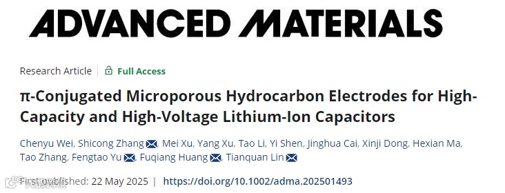 C. Wei, S. Zhang, M. Xu, Y. Xu, T. Li, Y. Shen, J. Cai, X. Dong, H. Ma, T. Zhang, F. Yu, F. Huang, T. Lin, π-Conjugated Microporous Hydrocarbon Electrodes for High-Capacity and High-Voltage Lithium-Ion Capacitors. Adv. Mater. 2025, 2501493.