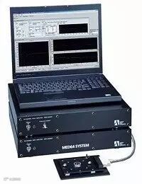 MED64平面微电极阵列记录系统是日本Alpha MED Scientific Inc.公司(简称“MED64”前松下Panasonic子公司)生产的完整易用的多通道离体胞外神经电生理研究工具。使用者可以方便快捷的对离体材料如脑片、心肌切片、培养的神经细胞或心肌细胞、干细胞等材料进行电生理检测;被试细胞或组织直接在电极涂层物质上培养,可以允许测量到细胞外直接相邻的局部电变化,同时并行记录多个细胞的电生理信号。MED64设备可以同时记录和刺激不同位点;而且,MED64记录还是非侵入式的,因此不会损伤细胞,这个特性使其适用于在同一个培养样本上进行长时程记录和重复记录,因而允许监视培养物对药物刺激的响应的较长时间的演变。