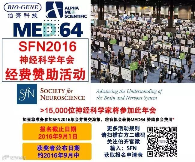 *为了支持并鼓励各位MED用户参加本年度的神经科学大会 (SFN)。MED64公司宣布:MED64用户只需向邮箱award@med64.com发送申请表(关注伯齐官微下载),并附上您要提交给SFN年会的海报初稿;经MED64公司评估后,第一名将获得高达2,500美元的赞助,用于支付神经科学会议2016注册费用,酒店和旅途费用,并获赠5个MED免费标准电极;亚军和季军作品将各获得5个MED免费标准电极。