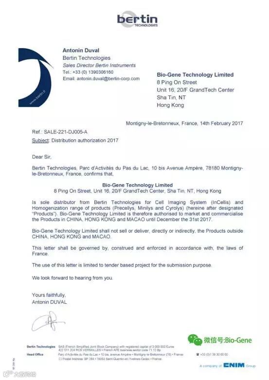 伯齐科技法国Bertin Instruments相关产品中国独家代理商授权书