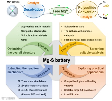 二次电池因其能量转换效率高、使用寿命长和潜在的低成本而最有前途。在过去的十年中,已经研究了各种新型电池,包括碱金属-硫电池,例如室温(RT)钠-硫(Na-S)和钾-硫(K-S)电池,以及其他金属-硫电池,例如镁-硫(Mg-S)、铝-硫(Al-S)、锌-硫(Zn-S)和钙-硫(Ca-S)电池。然而,新兴的金属硫电池面临着严峻而复杂的挑战,与锂离子电池(LIB)相比,镁离子电池(MIB)其输出的体积容量比LIB高两倍。同时,镁在地球上资源丰富,环境友好。然而,镁电池的开发仍然存在一些关键问题,严重阻碍了可充电镁电池(RMBs)的商业化。目前阻碍Mg-S电池实际应用的障碍主要体现在:不导电的硫正极反应动力学缓慢、相容性电解质的设计、镁负极抗钝化的表面优化等。众所周知,Mg2+与电解质中的溶剂配位形成大的溶剂化结构,并且需要在Mg2+参与电化学反应之前或期间脱溶剂。在电极/电解质界面上,脱溶剂步骤和正极或负极氧化还原步骤相互耦合,可视为不同途径的级联反应。然而,目前对Mg-S电池正极的研究现状及进一步发展仍然缺乏系统而深入的总结和分析。