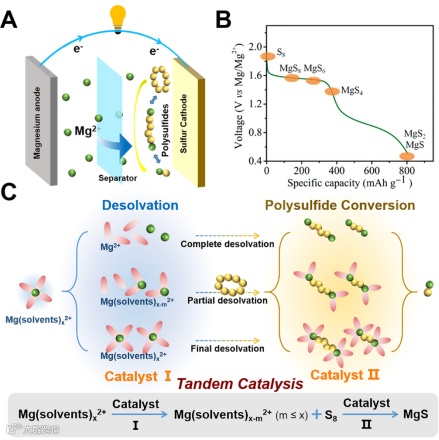 要点一:Mg-S电池放电过程中硫正极上去溶剂化过程和典型的串联催化反应
