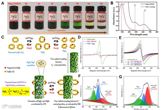 由于二价离子的高电荷密度, Mg2+与溶剂会形成大的溶剂化结构,并产生具有巨大空间效应的团簇,不仅阻碍了Mg2+在电解液中的迁移,而且导致反应动力学连续缓慢。在转化型电极上进行氧化还原转化反应的一个必要条件是溶剂化Mg(solvents)x2+的快速解离,虽然镁离子的脱溶究竟发生在反应的哪个阶段还不清楚,但反应的起始和终止状态是一致的,也是确定的,即从固态硫到液态多硫化物,最后转化为固态MgS,那么无论中间过程的载体形式如何,脱溶必然发生在整个反应过程中,因此去溶剂化是不可避免的。