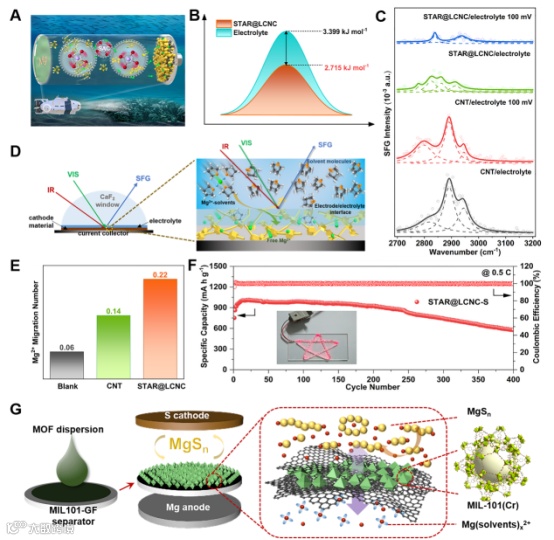 在实际电池环境中,在到达硫正极之前,Mg2+倾向于与电解质中的溶剂分子合作以形成Mg(solvents)x2+。在硫/电解质界面处,大尺寸的Mg(solvents)x2+团簇首先解离形成Mg2+,这是多硫化物氧化还原转化反应的前提。因此,Mg2+在界面或正极内部的去溶剂化和扩散行为与Mg(solvents)x2+溶剂化结构的状态密切相关。将配位溶剂分子从Mg(solvents)x2+溶剂化鞘中解离出来对于形成自由分离的Mg2+显得非常重要。一般来说,从Mg(solvents)x2+中直接分离溶剂分子涉及相关化学配位键的断裂,从而呈现高能量势垒。因此,有必要降低用于形成Mg2+的界面屏障以平滑地扩散穿过正极/电解质界面。