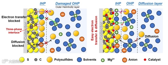 Mg-S化学反应是发生在导电基质和电解质之间的界面处的大多数界面反应。为了提高硫的利用率,应扩大导电碳基体/电解质/硫三相界面的重叠区域,并在三相界面引入合适的催化位,以促进Mg2+与S的结合,促进后续的硫/硫化物转化。同时需要注意的是,应设计合适的碳结构或催化位点,限制多硫化物的扩散,防止它们穿梭到镁负极侧形成“死硫”。还需要确保催化剂充分暴露而不被硫化物覆盖和钝化,以有效增强Mg-S电池的可逆性。双电层(EDL)由扩散层和亥姆霍兹层组成,其中亥姆霍兹层又分为内亥姆霍兹面(IHP)和外亥姆霍兹面(OHP)。通过添加催化中心,S正极表面的EDL组分被重构。由于催化剂对Mg2+的去溶剂化和吸附的催化作用,Mg(solvents)x2+结构将被吸引向正极/电解质界面移动。当Mg(solvents)x2+结构与S正极表面接触时,由于催化剂对未来转化反应的催化作用,Mg2+经历快速去溶剂化。与IHP中溶剂分子显著增加的空白样品相比,催化剂将大量游离Mg2+和多硫化物限制在三相界面,进一步加速了后续的硫/硫化物转化。